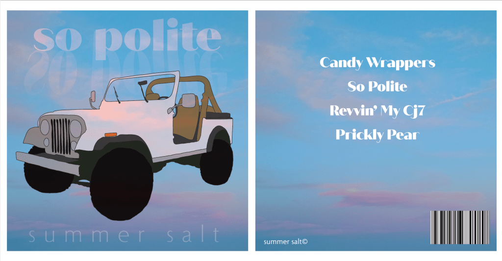This is a cover I designed as an assignment for class for the album So Polite by the band Summer Salt. I drew the Jeep on the cover in Photoshop and assembled the entire spread in Illustrator.